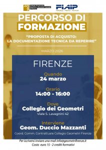 Si informano gli iscritti che il Collegio dei Geometri di Firenze, in collaborazione con FIAIP Firenze Prato Pistoia, ha in programma per il prossimo 24.03.2026 il corso  “PROPOSTA DI ACQUISTO:  LA DOCUMENTAZIONE TECNICA DA REPERIRE” (e non RELAZIONE TECNICA E DOCUMENTI DA REPERIRE” come erroneamente pubblicato in precedenza).